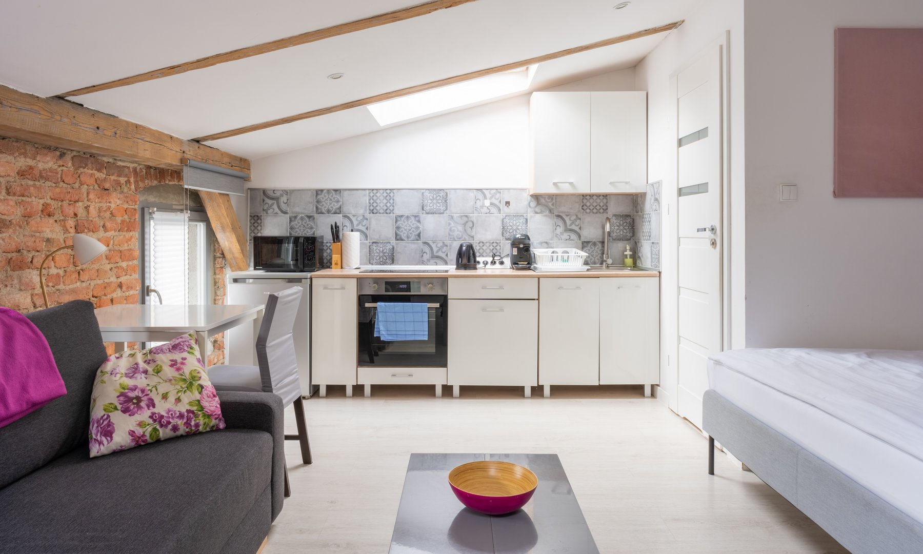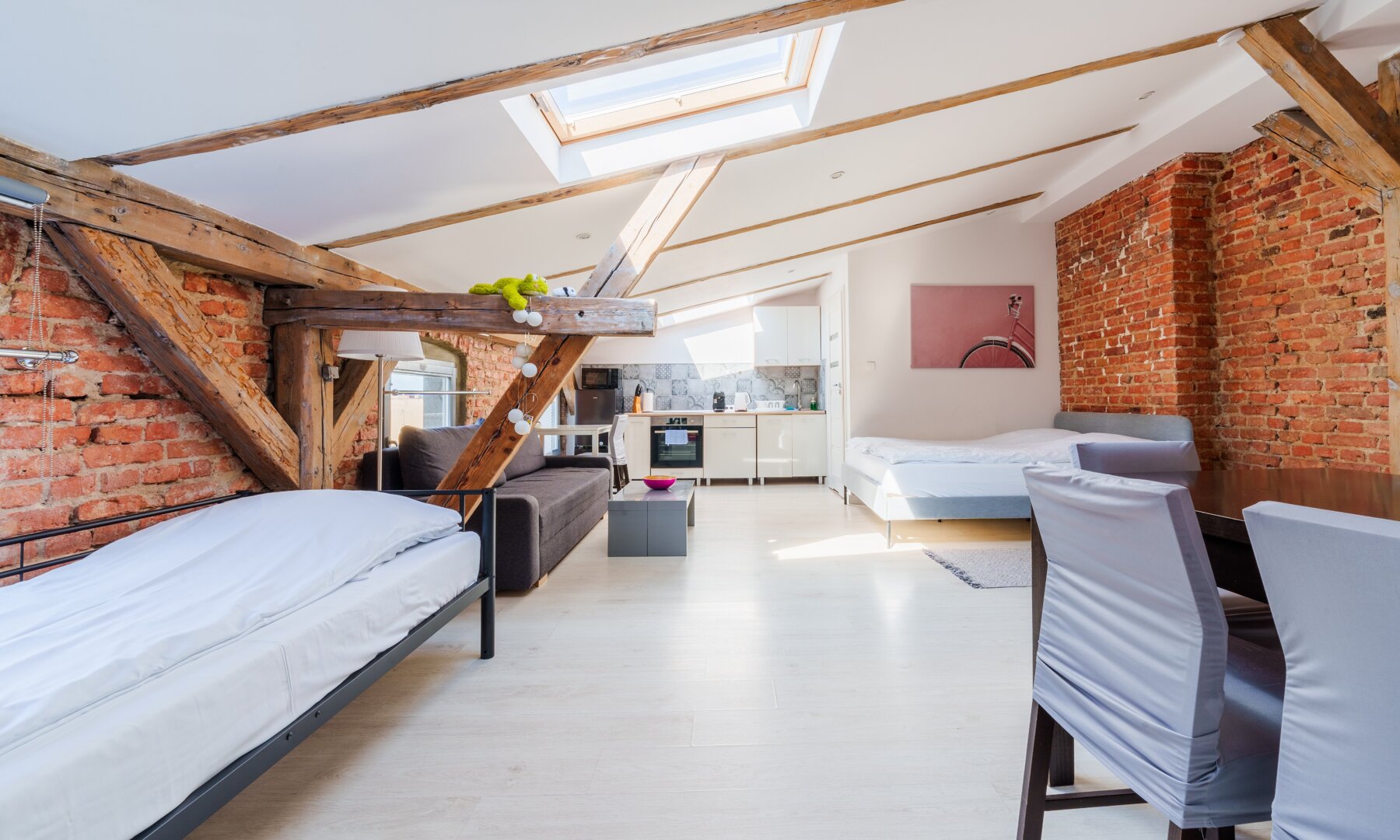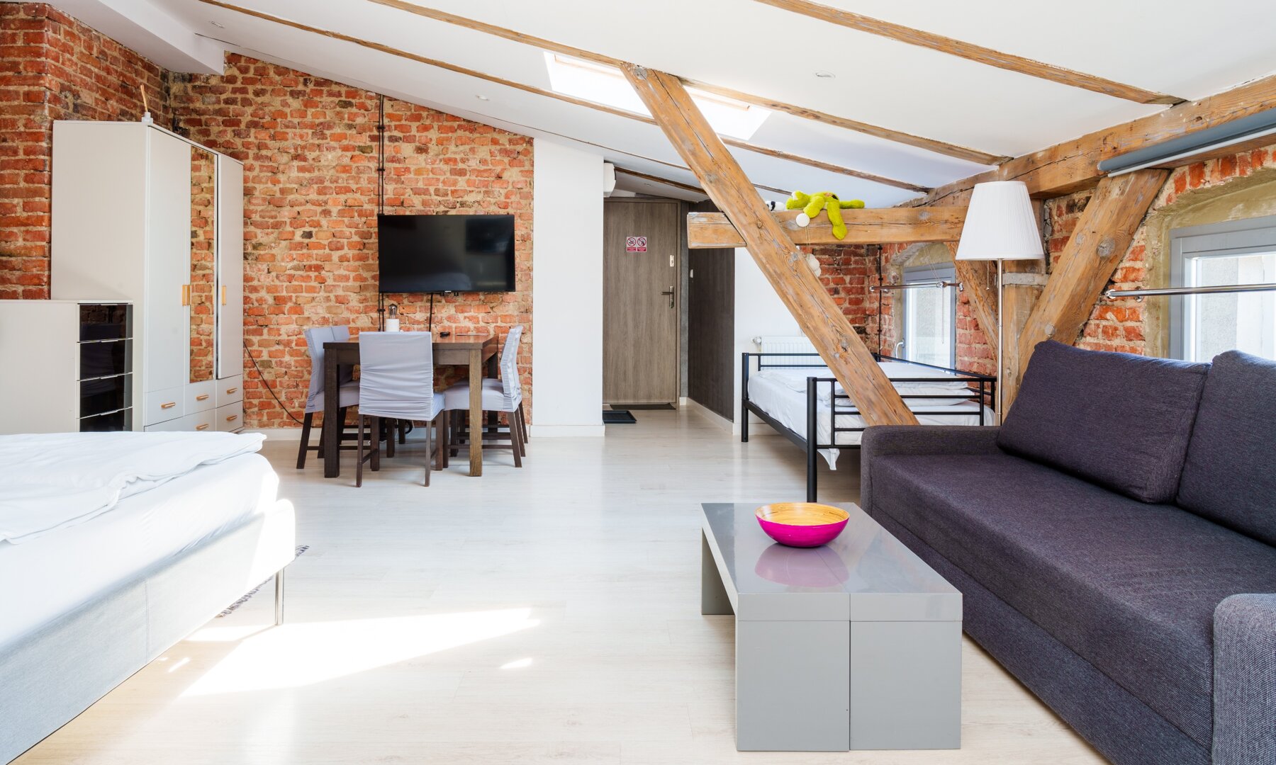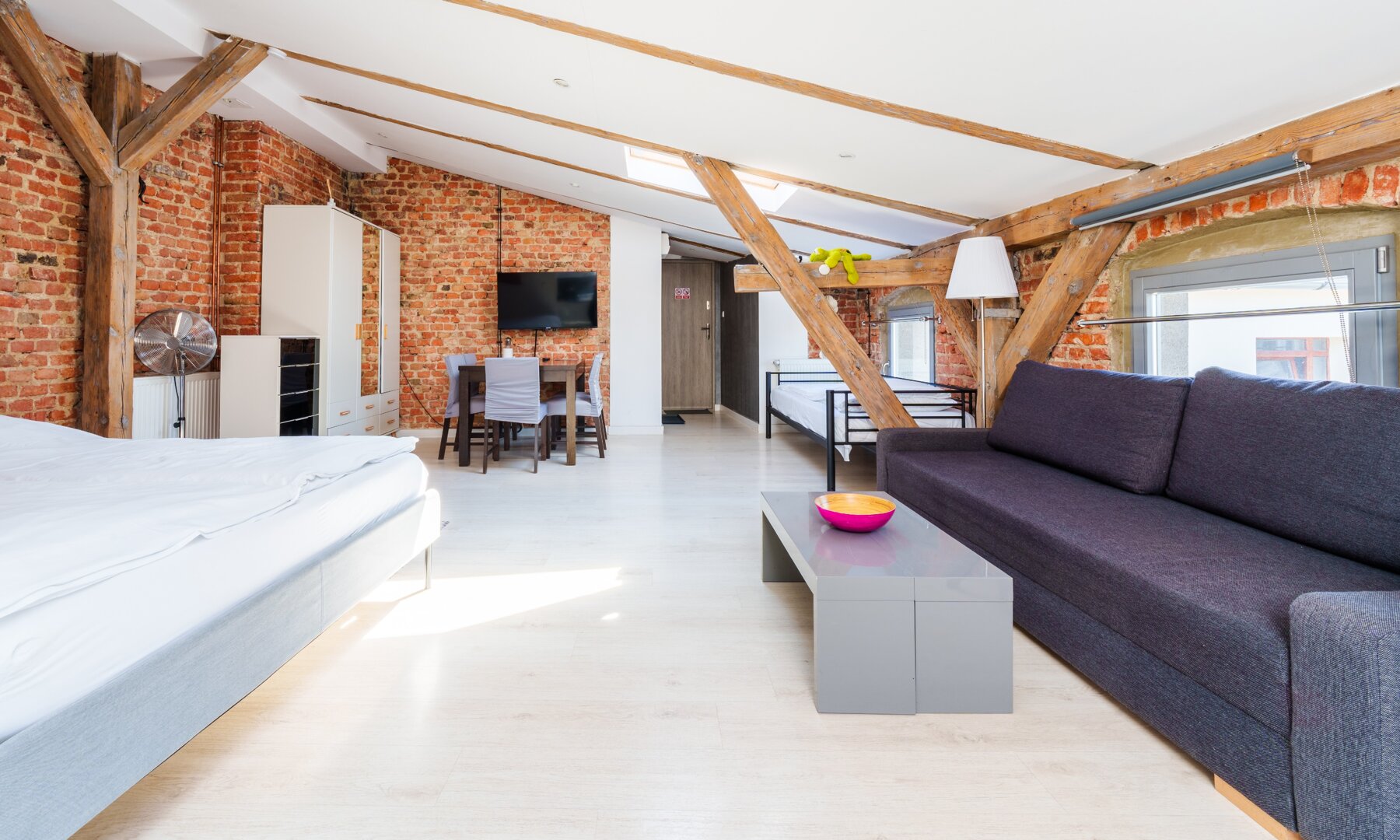 Apartament w pełni wyposażony, posiada jedno duże łóżko oraz jedną rozkładaną dwuosobową sofę oraz biurko do pracy.