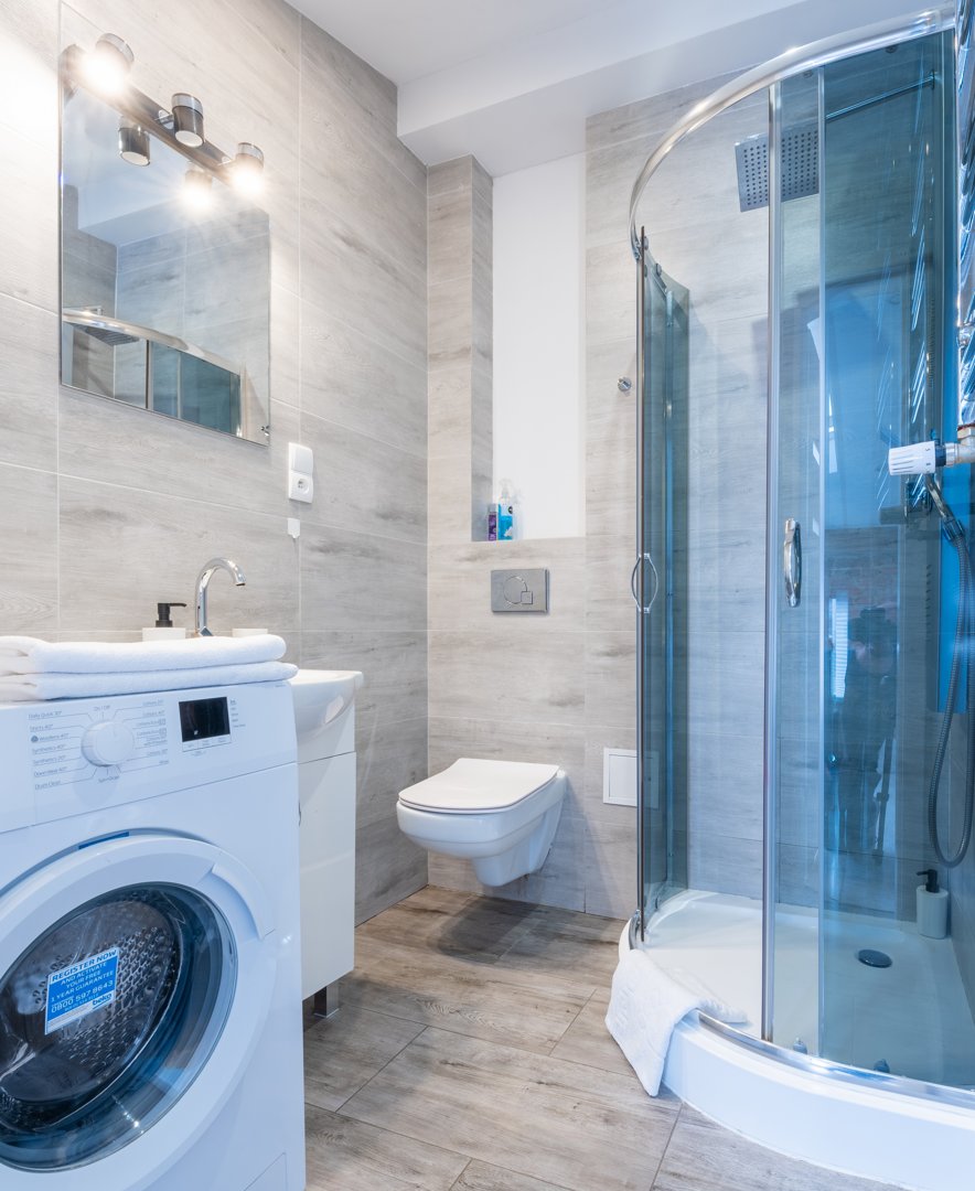 Kabina prysznicowa, umywalka, szafka, lustro, ręczniki, WC, pralka