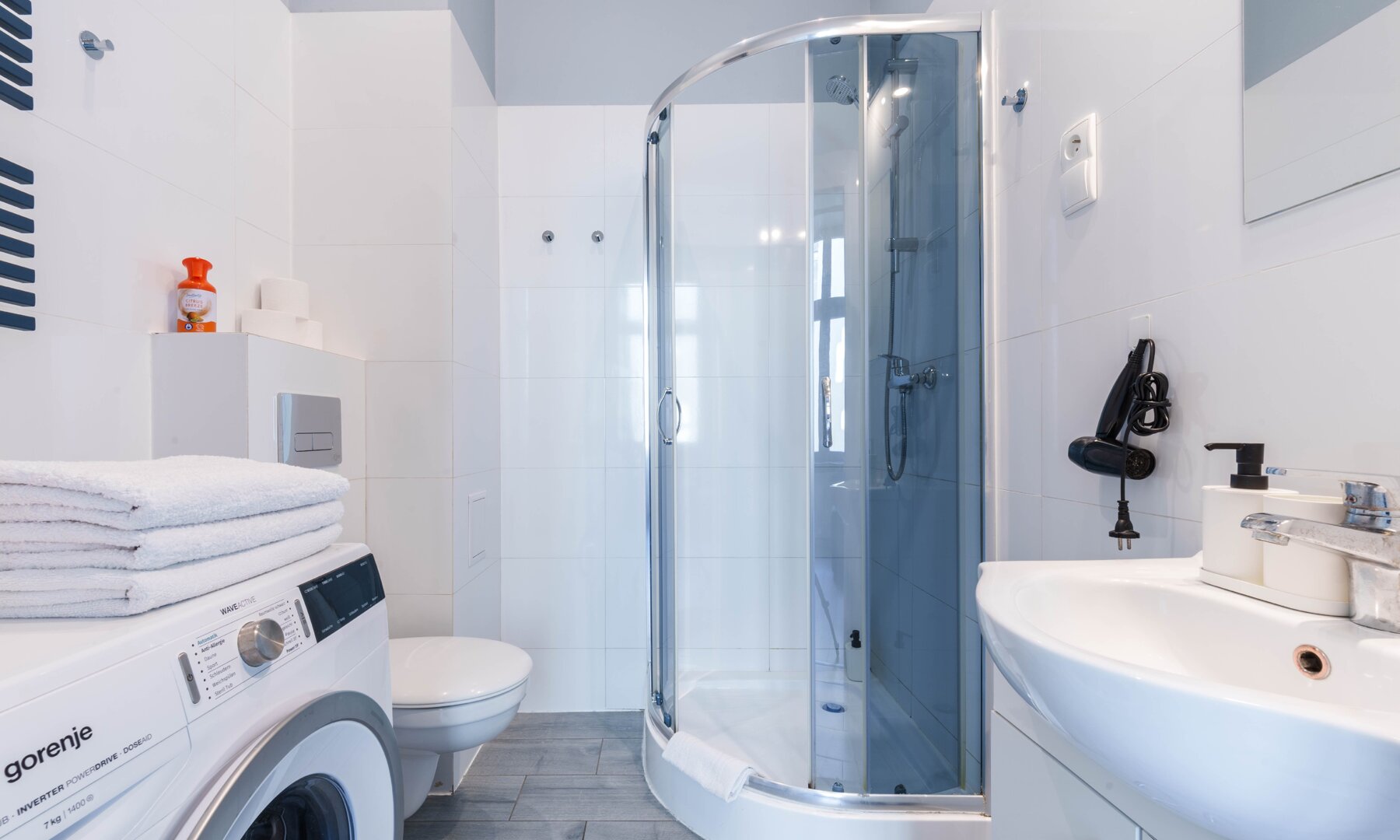 Kabina prysznicowa, umywalka, szafka, lustro, ręczniki, WC, pralka