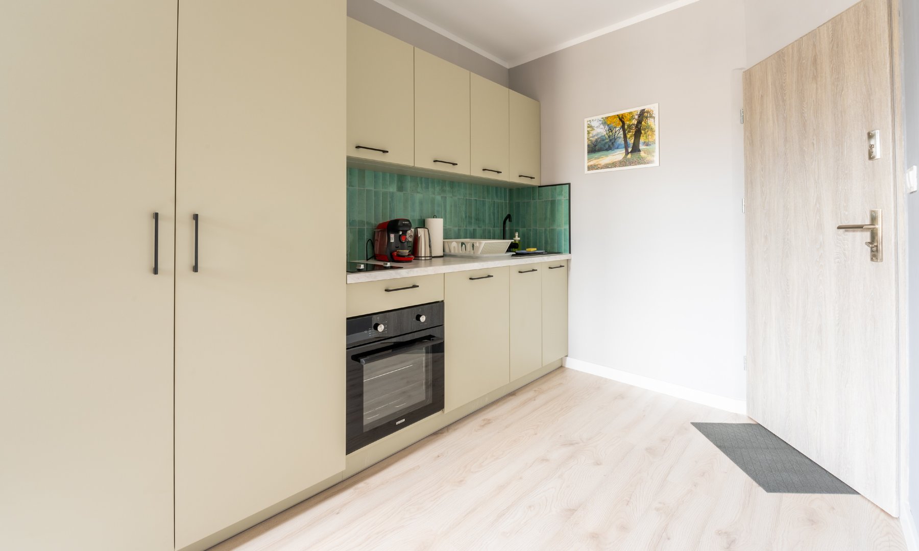 Lodówka z zamrażalką, ekspres do kawy (Bosch TASSIMO), piekarni, indukcyjna płyta grzewcza, czajnik, szklanki, kubki, filiżanki, zestaw naczyń kuchennych, sztućce, noże