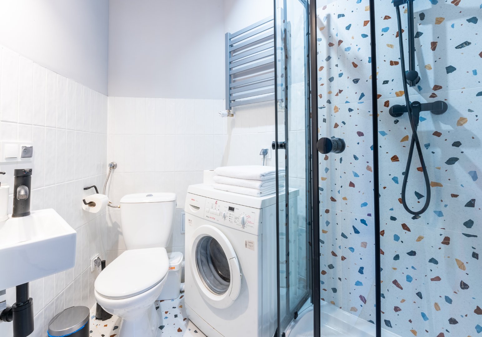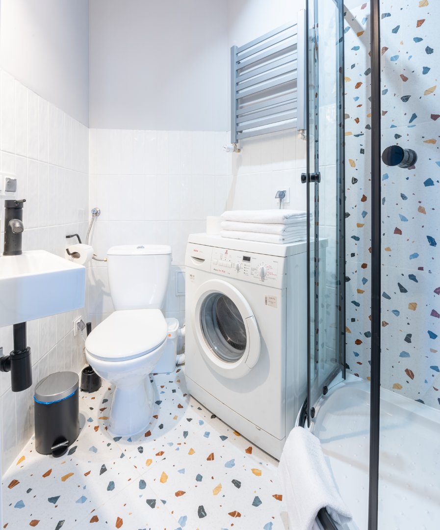Kabina prysznicowa, umywalka, szafka, lustro, ręczniki, WC, pralka