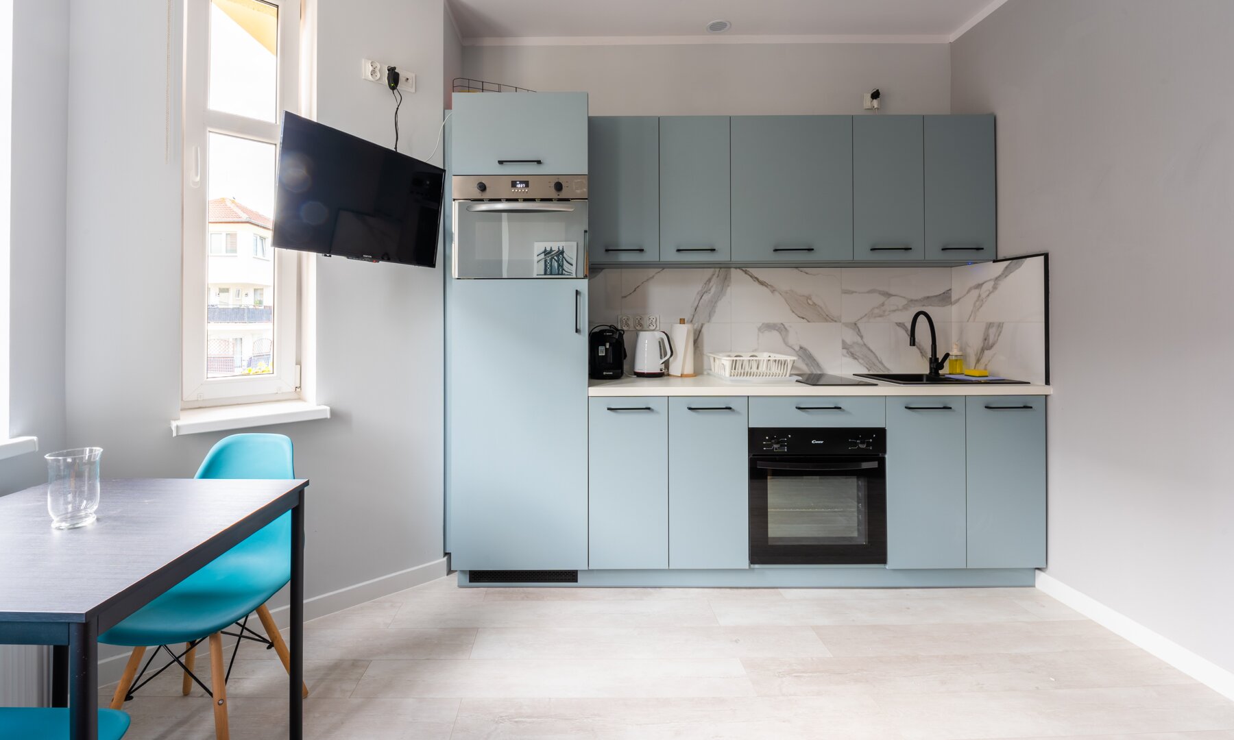 Lodówka z zamrażalką, ekspres do kawy (Bosch TASSIMO), piekarni, indukcyjna płyta grzewcza, czajnik, szklanki, kubki, filiżanki, zestaw naczyń kuchennych, sztućce, noże