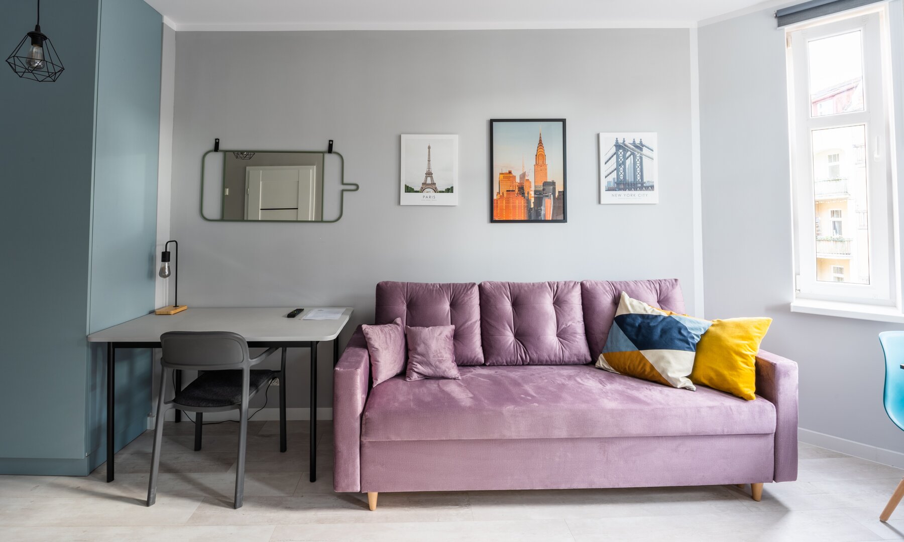 Duża rozkładana dwuosobowa sofa, wysoki stół z 2 krzesłami, szafa na ubrania, biurko z krzesłem do pracy