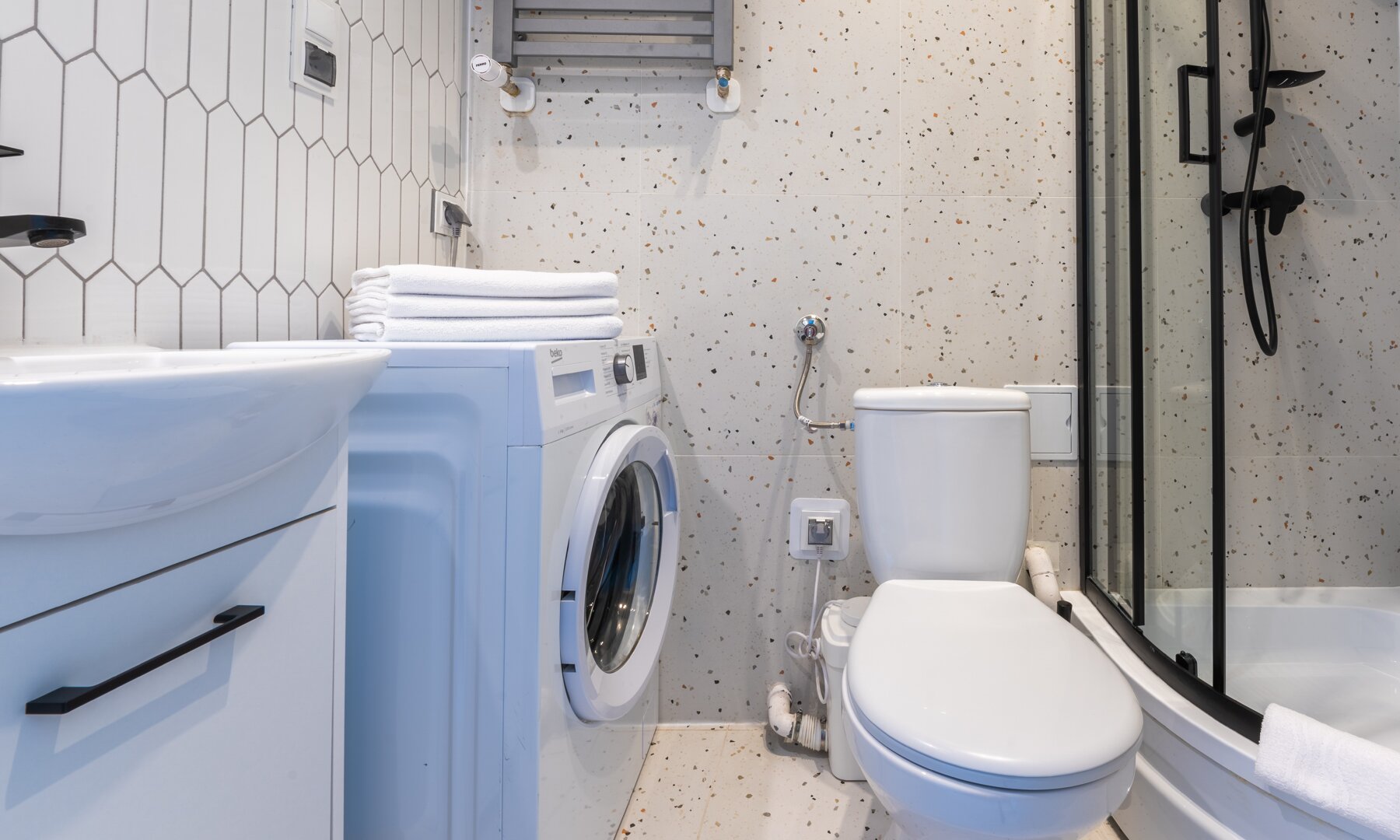 Kabina prysznicowa, umywalka, szafka, lustro, ręczniki, WC, pralka