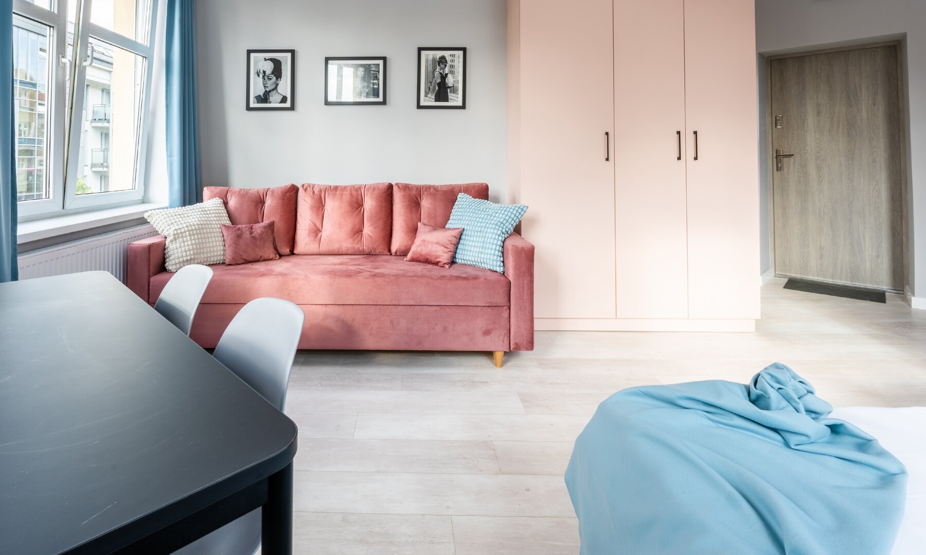 Apartament w pełni wyposażony, posiada jedną dużą rozkładaną dwuosobową sofę oraz biurko do pracy.