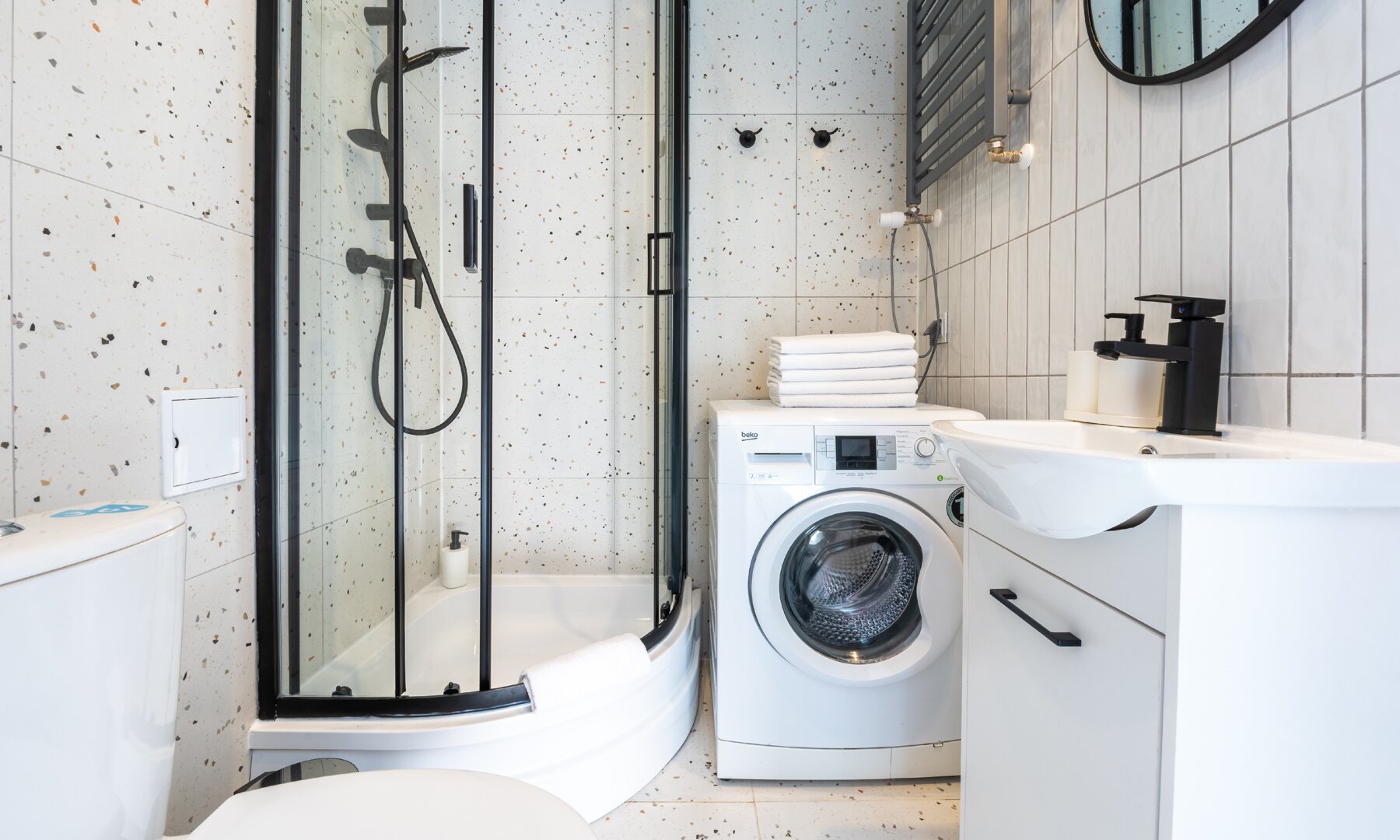 Kabina prysznicowa, umywalka, szafka, lustro, ręczniki, WC, pralka
