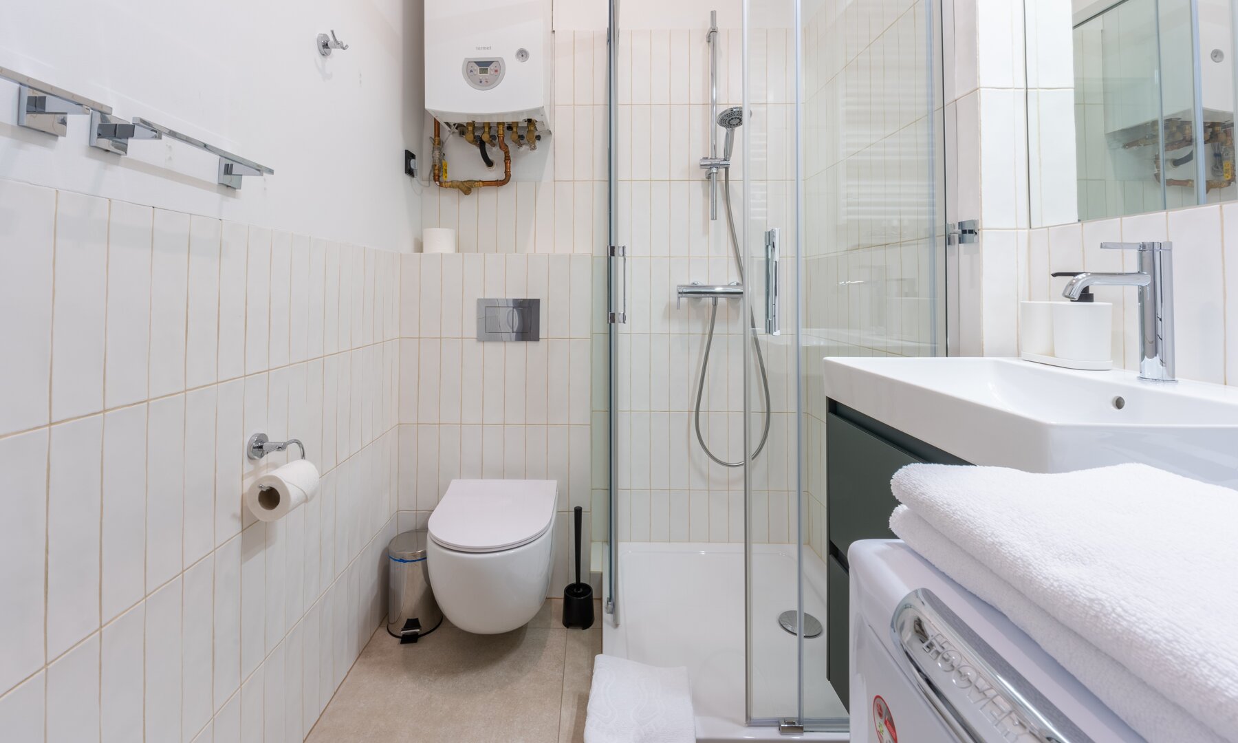 Kabina prysznicowa, umywalka, szafka, lustro, ręczniki, WC, pralka