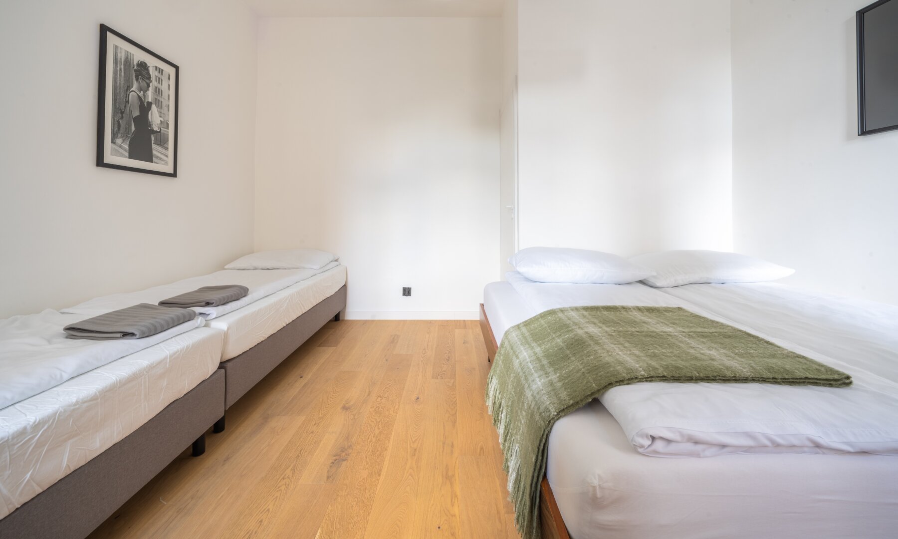 Apartament w pełni wyposażony, posiada salon z dużą rozkładaną sofą, stołem, TV i wyposażoną kuchnią oraz sypialnie trzema łóżkami (jedno łóżko 160x200 oraz dwa łóżka 90x200).