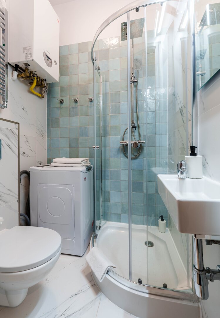 Kabina prysznicowa, umywalka, szafka, lustro, ręczniki, WC, pralka